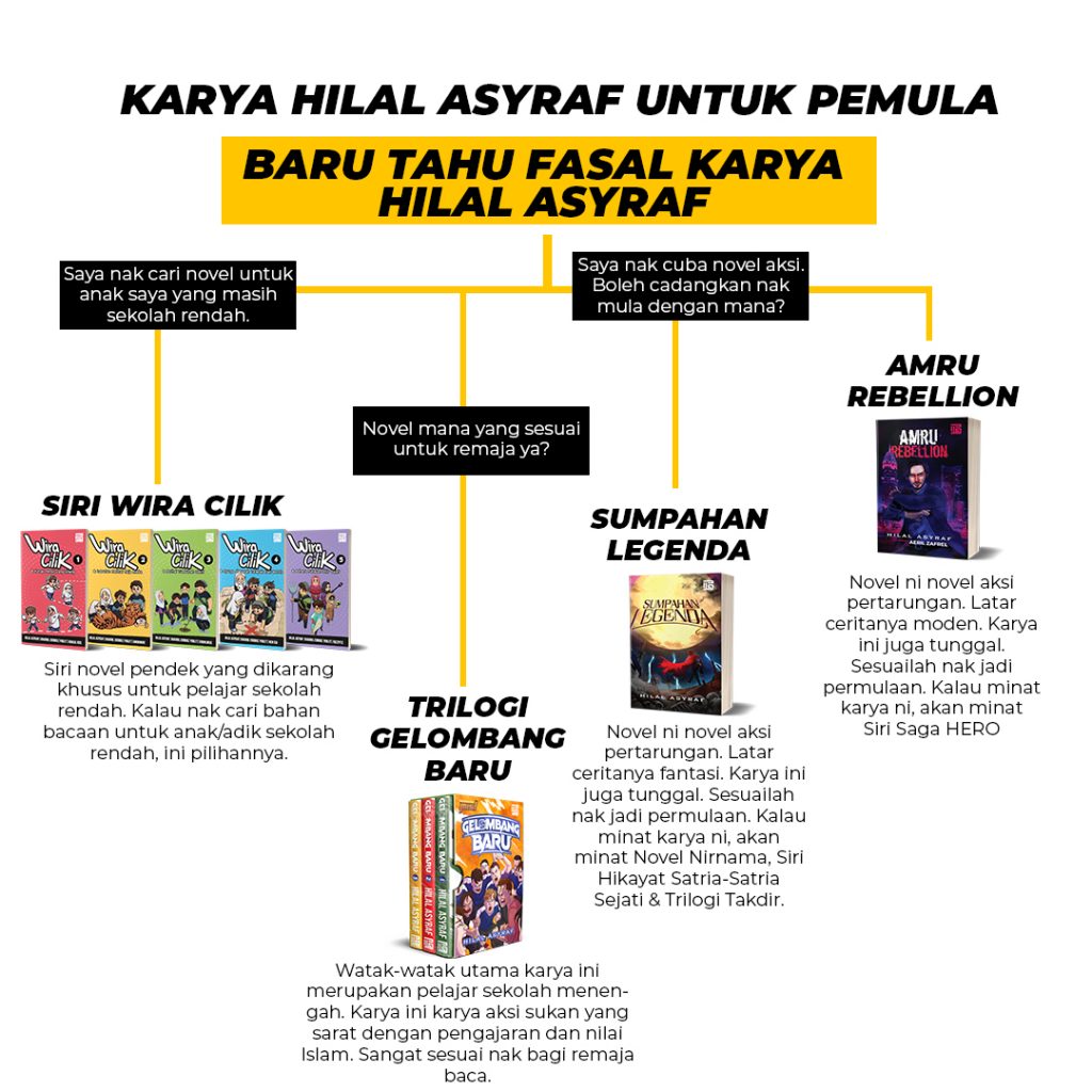 Anda minat karya fiksyen berlatar realistik? Cuba Saga Hero. Anda mahu mengembara ke alam fantasi epik? Cuba Siri Hikayat Satria-Satria Sejati. Anda mahu mencari karya sesuai untuk pelajar sekolah menengah? Trilogi Gelombang Baru jawapannya.