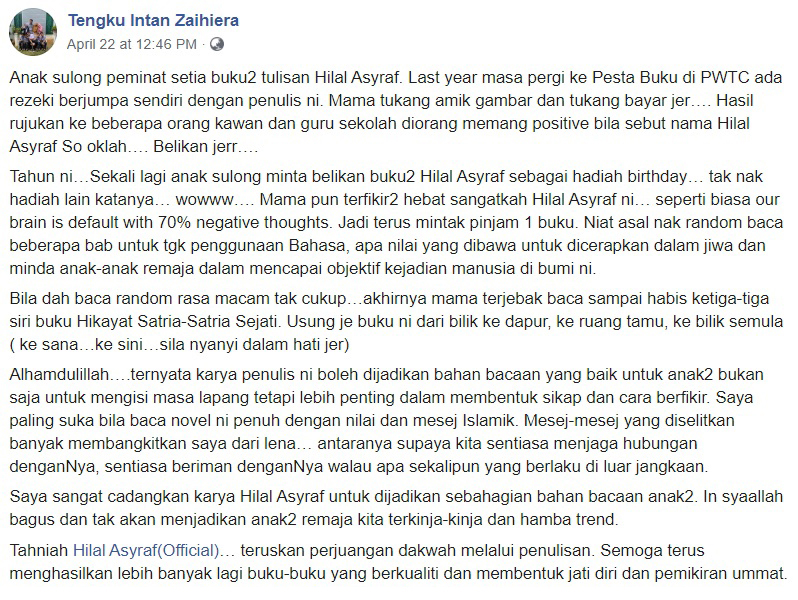 Karya Islamik juga tidak lagi dilihat sebagai karya yang lesu dan hanya bertazkirah panjang. Karya-karya Hilal Asyraf kaya dengan aksi dan plot yang buat pembaca tak henti menyelak setiap helaian muka surat.