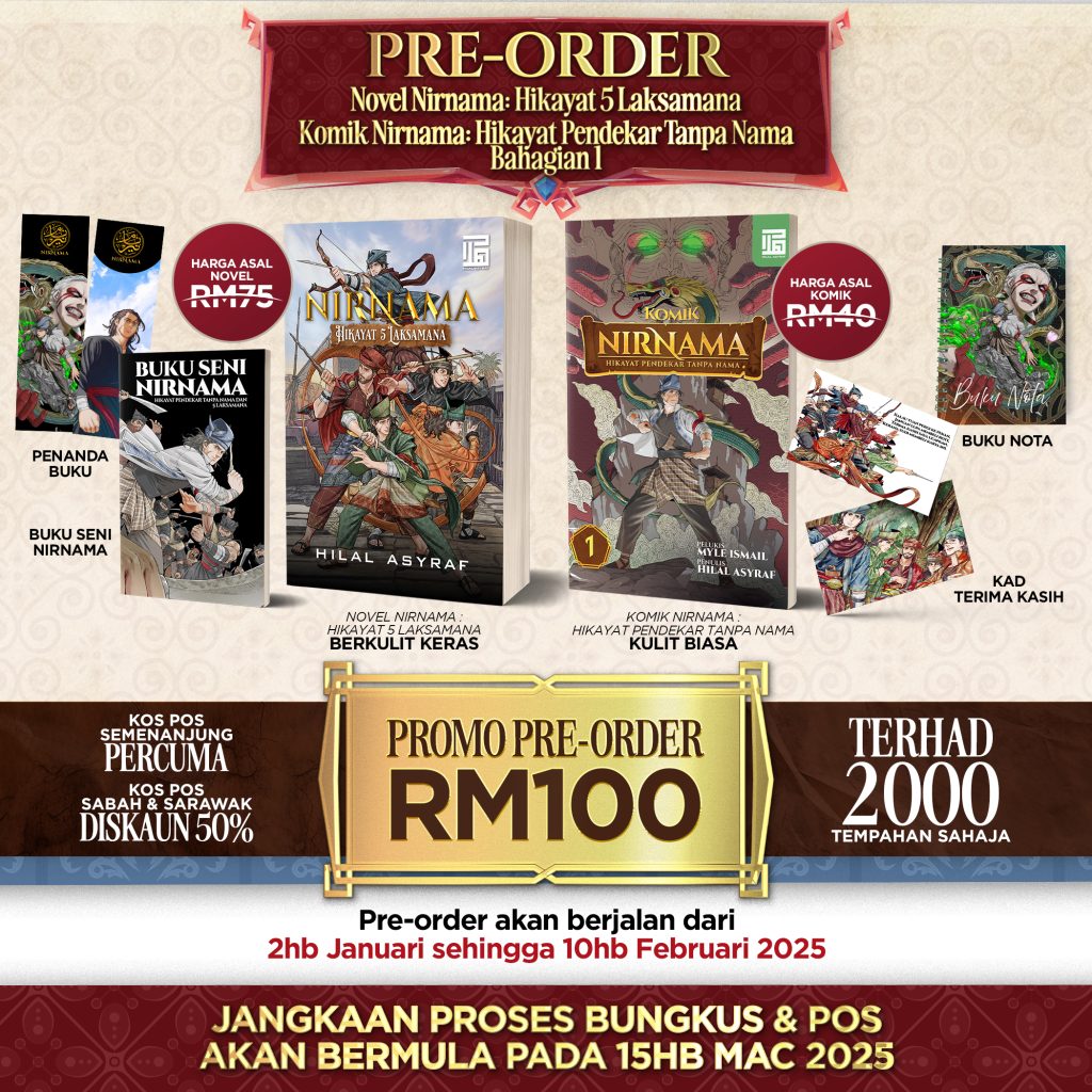 Dengan menyertai proses pre-order ini, anda akan memperolehi: 1 naskhah Novel Nirnama: Hikayat 5 Laksamana versi berkulit keras. 1 naskhah Komik Nirnama: Hikayat Pendekar Tanpa Nama bahagian 1. 1 naskhah Buku Seni Nirnama(yang terbaru) 1 naskhah Buku Nota NIrnama 2 keping penanda novel 1 keping kad terima kasih